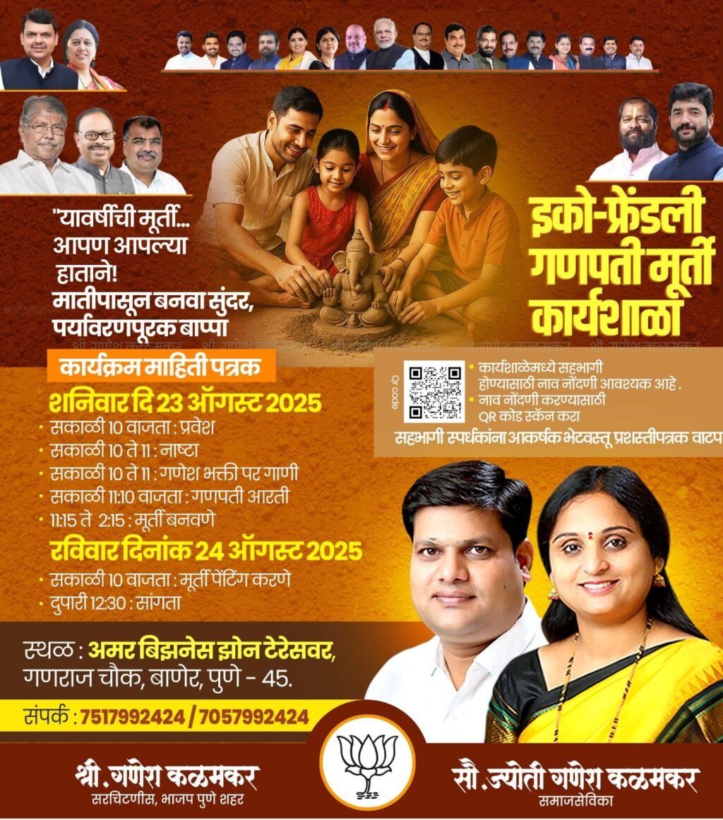 गणेशोत्सव जवळ येत असून, बाप्पाच्या आगमनाची तयारी सुरू झाली आहे. पर्यावरणपूरक गणेशोत्सव साजरा करण्याच्या उद्देशाने, बाणेर येथे माजी नगरसेविका सौ. ज्योती गणेश कळमकर आणि भाजप पुणे शहराचे सरचिटणीस श्री. गणेश ज्ञानोबा कळमकर यांच्या वतीने ‘इको-फ्रेंडली गणपती मेकिंग कार्यशाळेचे’ आयोजन करण्यात आले आहे. या कार्यशाळेत सहभागी होऊन शाडू मातीपासून स्वतःच्या हाताने गणपतीची मूर्ती तयार करण्याची संधी बाणेर, बालेवाडी, पाषाण सुतारवाडी, सोमेश्वरवाडी, सूस, महाळुंगे परिसरातील मुलांना व नागरिकांना मिळणार आहे.
