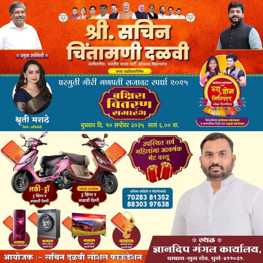 प्रभाग क्रमांक नऊ (सोमेश्वरवाडी, पाषाण सुतारवाडी, बाणेर, बालेवाडी, सुस व महाळुंगे) येथील महिला भगिनींसाठी सचिन दळवी सोशल फाउंडेशन तर्फे, भाजपा कोथरूड विधानसभा उत्तर मंडल सरचिटणीस सचिन चिंतामणी दळवी यांच्या वाढदिवसानिमित्त आयोजित करण्यात आलेल्या घरगुती गौरी गणपती सजावट स्पर्धा २०२५ चा बक्षीस वितरण समारंभ बुधवार दि. १० सप्टेंबर २०२५ रोजी सायं. ६ वा. ज्ञानदीप मंगल कार्यालय, पाषाण-सुस रोड येथे संपन्न होणार आहे.