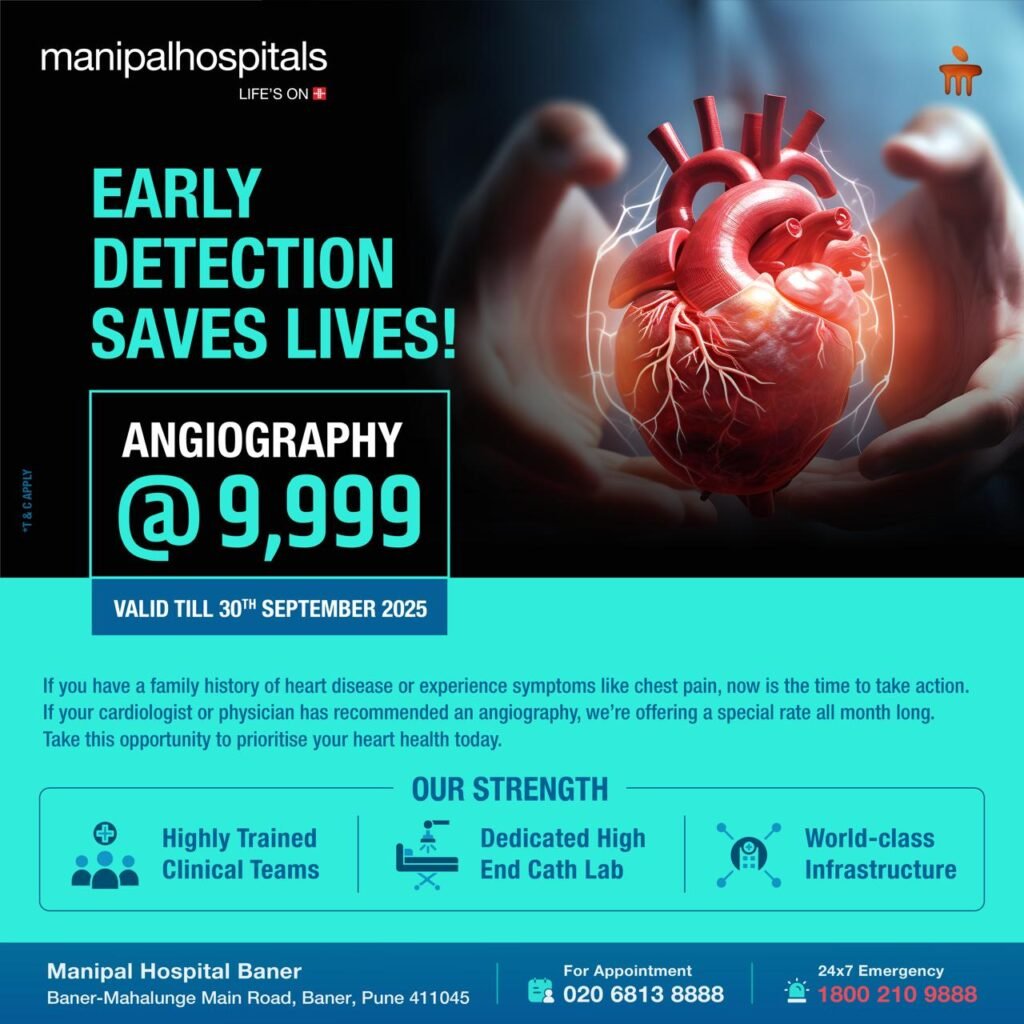 हृदयविकाराचे प्रमाण दिवसेंदिवस वाढत असून वेळेवर निदान झाल्यास गंभीर आजार टाळता येऊ शकतात. नागरिकांच्या आरोग्याच्या दृष्टीने महत्त्वाचे पाऊल उचलत मणिपाल हॉस्पिटल, बाणेर येथे एंजिओग्राफी फक्त ₹9,999 मध्ये करण्यात येणार आहे. ही विशेष ऑफर ३० सप्टेंबर २०२५ पर्यंत लागू राहणार आहे.