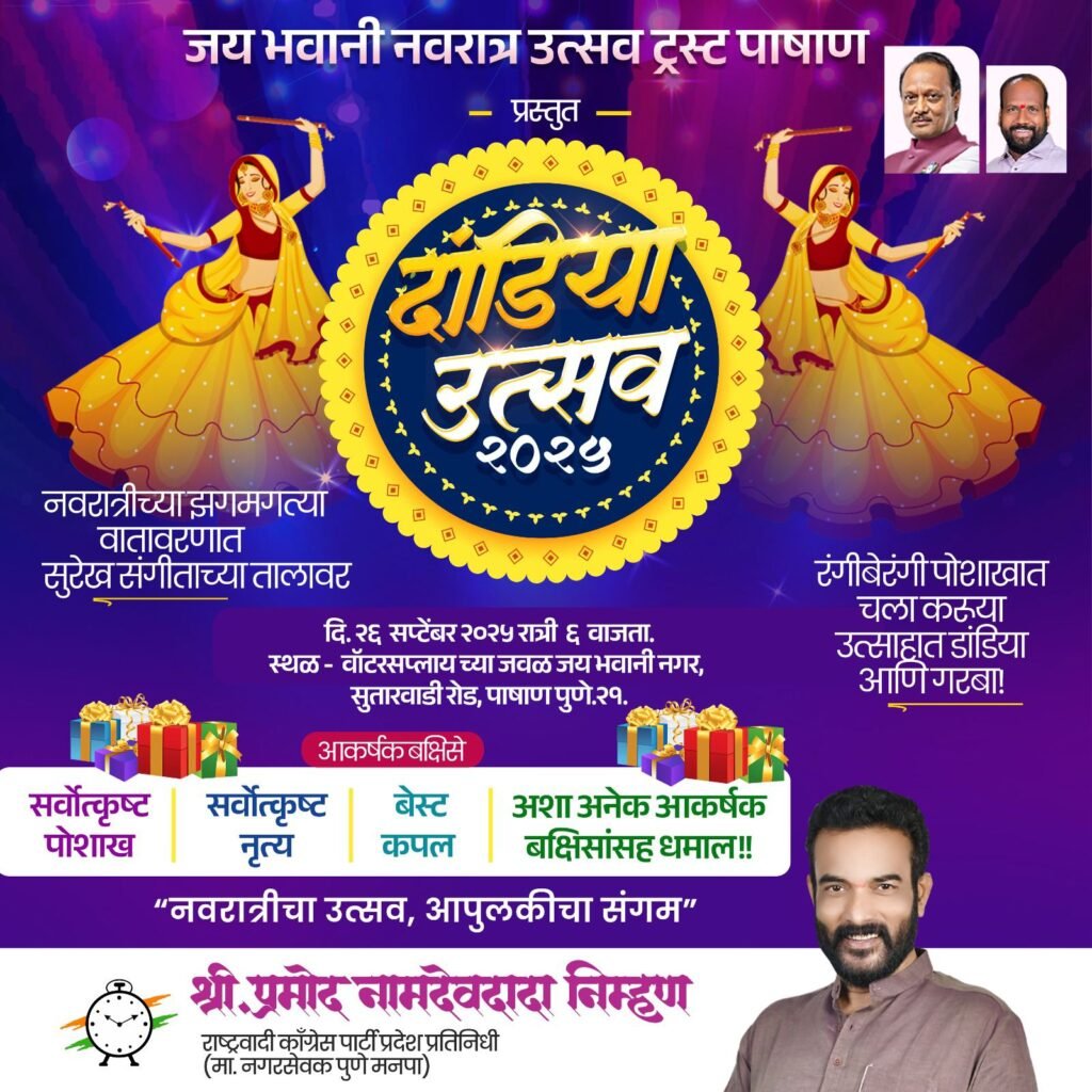 जय भवानी नवरात्र उत्सव ट्रस्ट पाषाण यांच्या वतीने यंदा भव्य दांडिया उत्सव २०२५ चे आयोजन करण्यात आले आहे. पाषाण येथे पहिल्यांदा माजी नगरसेवक प्रमोद निम्हण यांच्या वतीने नवरात्रीच्या जल्लोषात सजणाऱ्या या कार्यक्रमात सुरेख संगीताच्या तालावर दांडिया व गरब्याची रंगतदार मेजवानी नागरिकांना अनुभवायला मिळणार आहे.