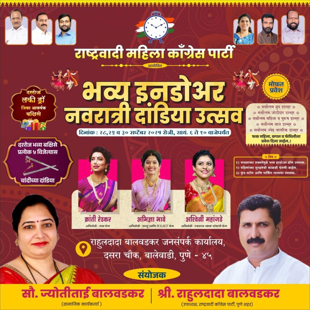 नवरात्रीच्या पार्श्वभूमीवर बालेवाडी परिसरात सांस्कृतिक उत्साहाला सुरुवात झाली असून माझी स्थायी समिती अध्यक्ष बाबुराव चांदेरे यांच्या मार्गदर्शनाखाली सौ. ज्योतिताई बालवडकर (राष्ट्रवादी महिला काँग्रेस) यांच्या पुढाकाराने तर श्री. राहुलदादा बालवडकर (उपाध्यक्ष, राष्ट्रवादी काँग्रेस पार्टी, पुणे शहर) यांच्या वतीने राष्ट्रवादी महिला काँग्रेस पार्टीतर्फे भव्य इनडोअर नवरात्री दांडिया उत्सव आयोजित करण्यात आला आहे. हा उत्सव २८, २९ व ३० सप्टेंबर २०२५ रोजी सायंकाळी ६ ते रात्री १० वाजेपर्यंत दररोज रंगणार असून नागरिकांसाठी प्रवेश मोफत ठेवण्यात आला आहे.
