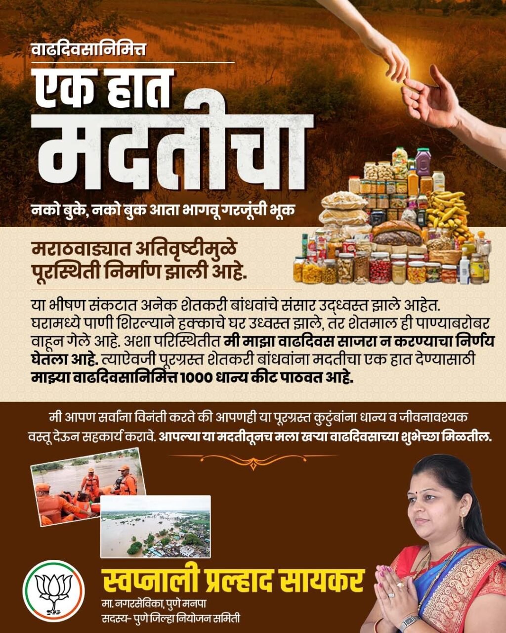 या पार्श्वभूमीवर पुणे महानगरपालिकेच्या माजी नगरसेविका आणि पुणे जिल्हा नियोजन समितीच्या माजी सदस्या स्वप्नाली प्रल्हाद सायकर यांनी आपला वाढदिवस साजरा न करता, पूरग्रस्त शेतकरी बांधवांच्या मदतीसाठी ‘एक हात मदतीचा’ हा सामाजिक उपक्रम राबवण्याचा निर्णय घेतला आहे.