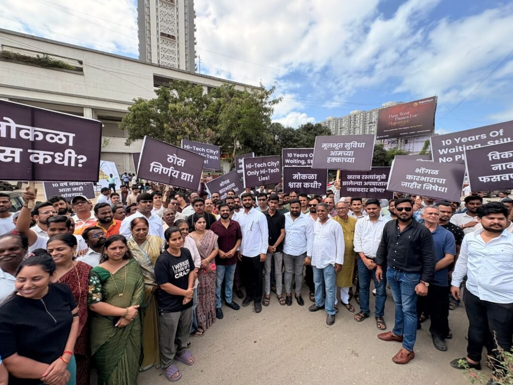 या सर्व समस्यांच्या पार्श्वभूमीवर जयेश मुरकुटे यांच्या पुढाकाराने आज दिनांक 5 ऑक्टोबर 2025 रोजी VTP अल्पाइन चौक तसेच गोदरेज हिलसाईड 1 सोसायटी समोर, याठिकाणी येथील शेकडो स्थानिक नागरिक, शेतकरी आणि मालमत्ताधारक या आक्रोश आंदोलनासाठी उपस्थित होते.
