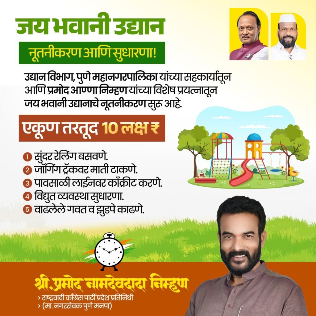 पुणे शहरातील नागरिकांच्या मनोरंजनासाठी आणि आरोग्यदायी जीवनशैलीसाठी अत्यंत महत्त्वाची असलेल्या जय भवानी उद्यानाचे नूतनीकरण व सुधारणा काम मोठ्या उत्साहात सुरू झाले आहे. पुणे महानगरपालिकेच्या उद्यान विभागाच्या सहकार्याने आणि राष्ट्रवादी काँग्रेस पार्टीचे शहर प्रतिनिधी तसेच माजी नगरसेवक प्रमोद निम्हण यांच्या विशेष प्रयत्नातून हा उपक्रम राबविण्यात येत आहे.