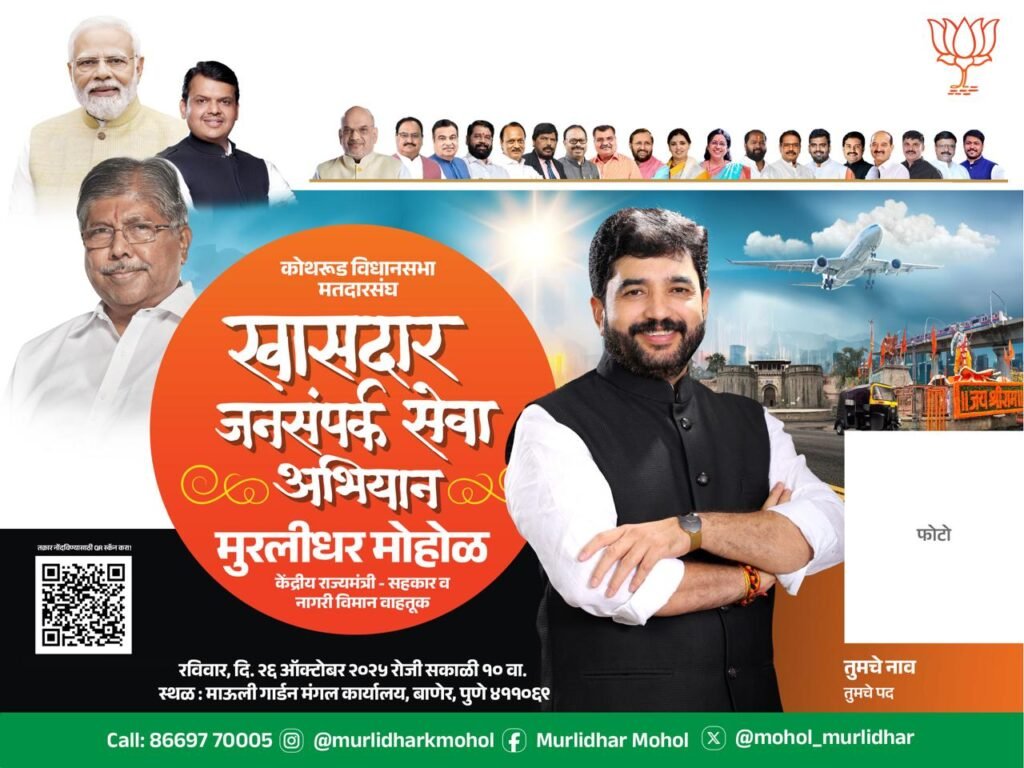 कोथरूड मतदारसंघातील नागरिकांच्या विविध शासकीय प्रश्न, तक्रारी आणि मागण्यांचे त्वरित निराकरण व्हावे यासाठी खासदार मुरलीधर मोहोळ यांच्या पुढाकाराने रविवारी, दिनांक 26 ऑक्टोबर 2025 रोजी, माऊली गार्डन, बाणेर येथे सकाळी 10 ते दुपारी 2 वाजेपर्यंत “जनता दरबार” आयोजित करण्यात आला आहे.