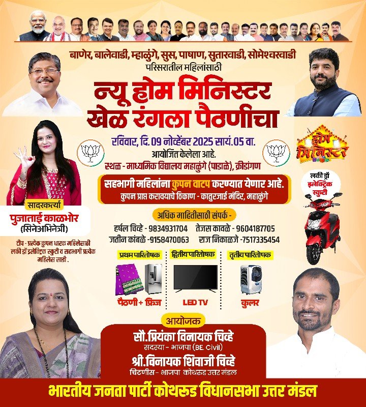 बाणेर, बालेवाडी, सुस, पाषाण, महाळुंगे, सोमेश्वरवाडी परिसरातील महिलांसाठी “न्यू होम मिनिस्टर खेळ रंगला पेठणीचा” हा मनोरंजक कार्यक्रम सौ. प्रियांका विनायक चिव्हे (सदस्य – भाजपा, बी.ई. सिव्हिल) व श्री. विनायक शिवाजी चिव्हे (चिटणीस भाजपा कोथरूड उत्तर मंडल) यांच्या वतीने आयोजित करण्यात आला आहे.