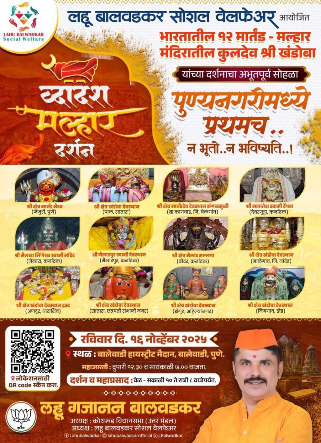 पुण्यनगरीच्या अध्यात्मिक परंपरेला नवा तेजोमय आयाम देणारा ‘द्वादश मल्हार दर्शन’ हा अभूतपूर्व सोहळा येत्या रविवार, दि. १६ नोव्हेंबर २०२५ रोजी बालेवाडी हायस्ट्रीट मैदानावर भव्यदिव्य स्वरूपात पार पडणार आहे. लहू बालवडकर सोशल वेलफेअरतर्फे आयोजित या अद्वितीय अध्यात्मिक पर्वात भारतातील बारा प्रमुख मार्तंड-मल्हार मंदिरांच्या पवित्र पादुका प्रथमच पुण्यात एकत्र येणार असल्याने भक्तांमध्ये उत्सुकता आहे.