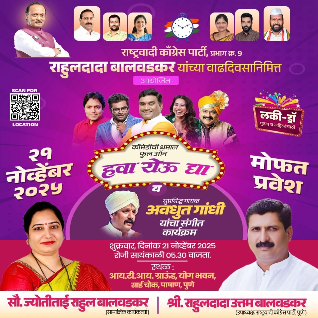 राष्ट्रवादी काँग्रेस पार्टी, प्रभाग क्रमांक ९ तर्फे मा. श्री. राहुलदादा उत्तम बालवडकर यांच्या वाढदिवसानिमित्त पाषाण परिसरात भव्य आणि रंगतदार मनोरंजनाचा कार्यक्रम आयोजित करण्यात आला आहे.