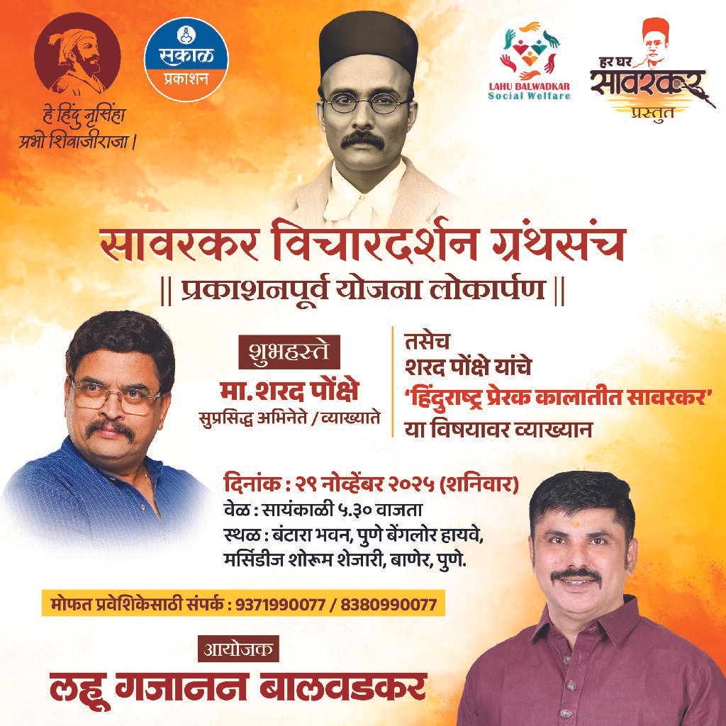 स्वातंत्र्यवीर विनायक दामोदर सावरकरांच्या क्रांतीशील विचारसरणीचा बहुआयामी परिचय करून देणाऱ्या ‘सावरकर विचारदर्शन’ ग्रंथसंचाच्या प्रकाशनपूर्व योजनेचे लोकार्पण आणि सुप्रसिद्ध अभिनेते – व्याख्याते शरद पोंक्षे यांचे जाहीर व्याख्यान आज शनिवार, २९ नोव्हेंबर २०२५ रोजी सायंकाळी ५.३० वाजता बाणेर येथील बंटारा भवनात आयोजित करण्यात आले आहे.