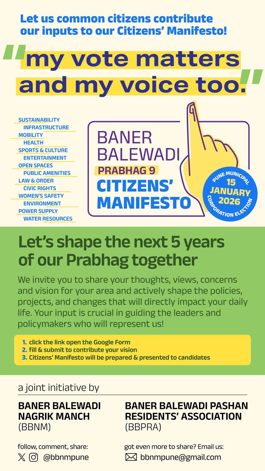 या पार्श्वभूमीवर Baner Balewadi Pashan Residents Association (BBPRA) आणि Baner Balewadi Nagrik Manch (BBNM) यांच्या संयुक्त विद्यमाने हा उपक्रम राबवण्यात येत आहे. हा जाहीरनामा कोणत्याही राजकीय पक्षाशी संलग्न नसून, पूर्णतः नागरिककेंद्री असणार आहे. सामान्य नागरिकांचे अनुभव, समस्या, गरजा, उपाययोजना आणि भविष्यासाठीची दृष्टी यांचा समावेश या जाहीरनाम्यात करण्यात येणार आहे.