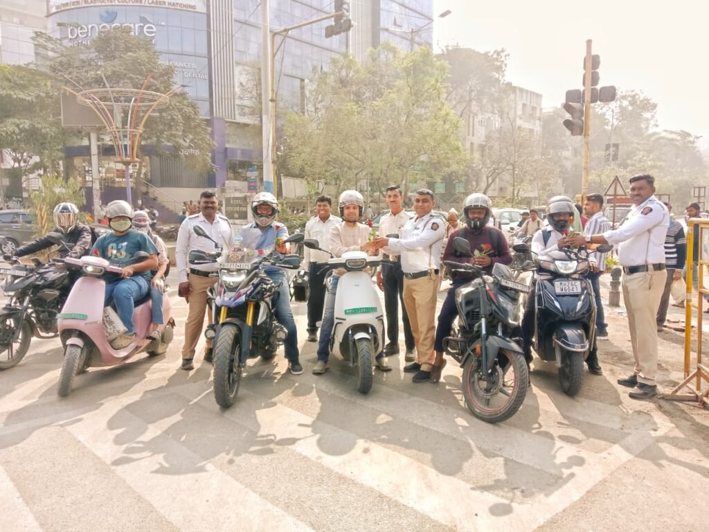 राष्ट्रीय रस्ता सुरक्षा सप्ताहाच्या अनुषंगाने (११ ते १७ जानेवारी) बाणेर वाहतूक विभाग, पुणे शहर यांच्या वतीने बाणेर रोडवरील सायकर चौक येथे विशेष जनजागृती अभियान राबविण्यात आले. या उपक्रमाअंतर्गत दुचाकीस्वार तसेच इतर वाहनचालकांना सिग्नलवर थांबवून गुलाबपुष्प देत वाहतूक नियमांचे महत्त्व समजावून सांगण्यात आले.