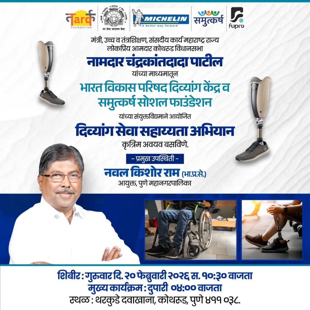 समाजातील दिव्यांग बांधवांना स्वावलंबी बनवण्यासाठी आणि त्यांच्या जीवनात नवी उमेद निर्माण करण्यासाठी राज्याचे उच्च व तंत्र शिक्षण मंत्री ना. चंद्रकांतदादा पाटील यांच्या पुढाकारातून आणि तर्क फाऊंडेशन, भारत विकास परिषद, फ्युप्रो, मिशेलिन आणि समुत्कर्ष सोशल फाऊंडेशन यांच्या संयुक्त विद्यमाने दिनांक २० फेब्रुवारी रोजी मोफत कृत्रिम अवयव वितरण सोहळ्याचे आयोजन करण्यात येणार आहे.