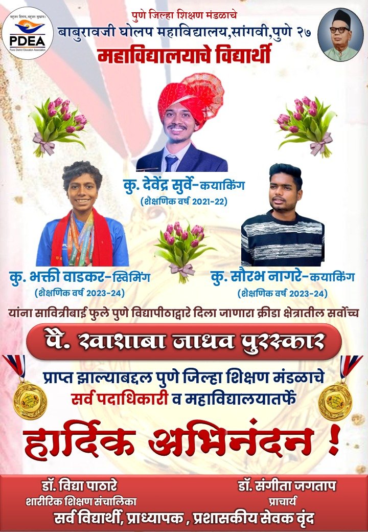 सावित्रीबाई फुले पुणे विद्यापीठाद्वारे दिला जाणारा क्रीडा क्षेत्रातील सर्वोच्च पै. खाशाबा जाधव पुरस्कारामध्ये पुणे जिल्हा शिक्षण मंडळाच्या सांगवी येथील बाबुरावजी घोलप महाविद्यालयाच्या 3 विद्यार्थ्यांनी पै. खाशाबा जाधव पुरस्कार जाहीर झाला असून महाविद्यालयाच्या शिरपेचात मानाचा तुरा रोवला आहे.