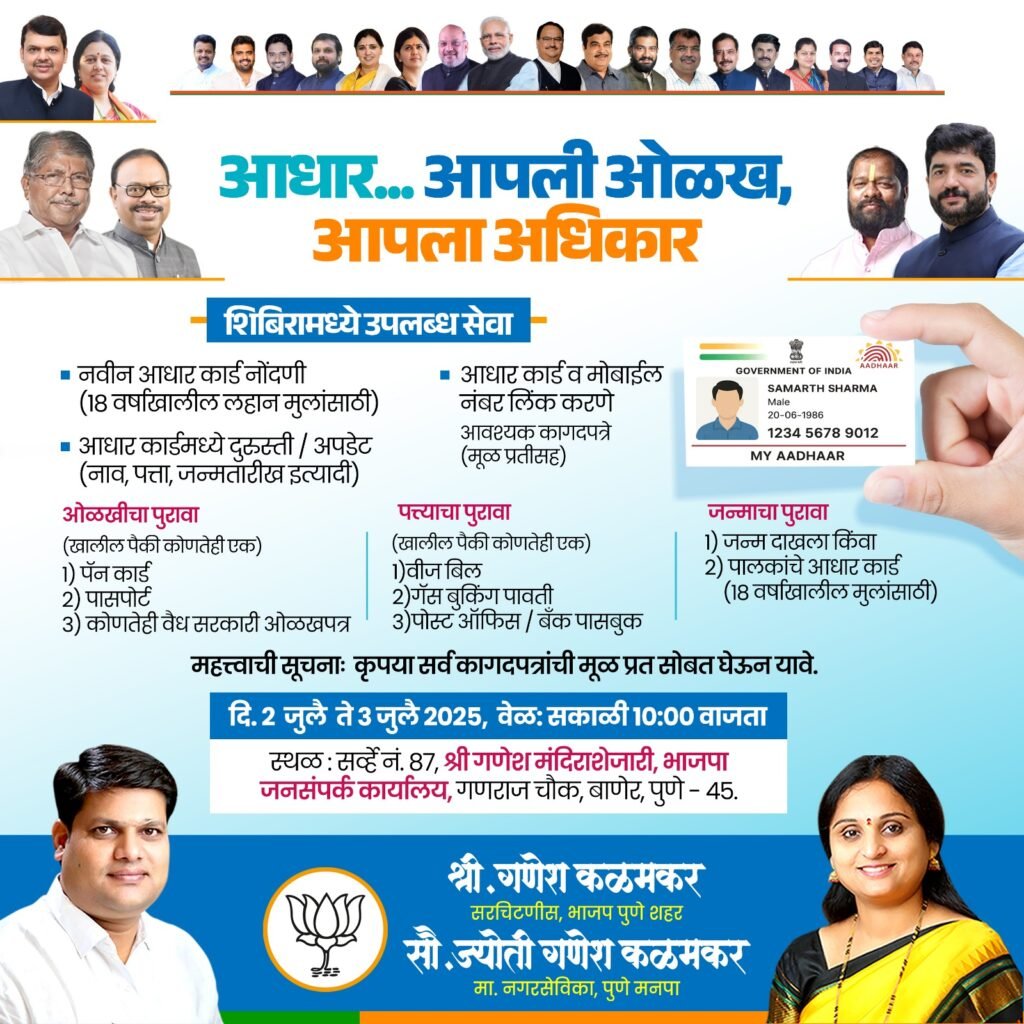 बाणेर बालेवाडी सुस महाळुंगे पाषाण सुतारवाडी सोमेश्वर वाडी औंध येथील नागरिकांसाठी श्री. गणेश कळमकर (सरचिटणीस, भाजपा पुणे शहर) आणि सौ. ज्योती गणेश कळमकर (मा. नगरसेविका, पुणे मनपा) यांच्या वतीने जेबाणेर येथे दि. २ जुलै ते ३ जुलै २०२५ रोजी सकाळी १०:०० वाजता आधार शिबिर आयोजित करण्यात आले आहे, जिथे नागरिक त्यांच्या आधार कार्डशी संबंधित विविध सेवांचा लाभ घेऊ शकतात.