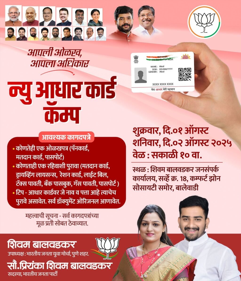 भाजपा पुणे शहर युवा मोर्चाचे उपाध्यक्ष शिवम बालवडकर आणि भाजपा सदस्य प्रियंका शिवम बालवडकर यांच्यावतीने नागरिकांसाठी ‘आपली ओळख, आपला अधिकार’ या घोषवाक्याखाली एक विशेष आधार कार्ड शिबिर आयोजित करण्यात आले आहे. या शिबिरात नवीन आधार कार्ड नोंदणी, आधार कार्ड दुरुस्ती, १८ वर्षांखालील मुलांसाठी आधार नोंदणी आणि आधार कार्डला मोबाईल नंबर लिंक करणे यांसारख्या सेवा मोफत उपलब्ध असतील.