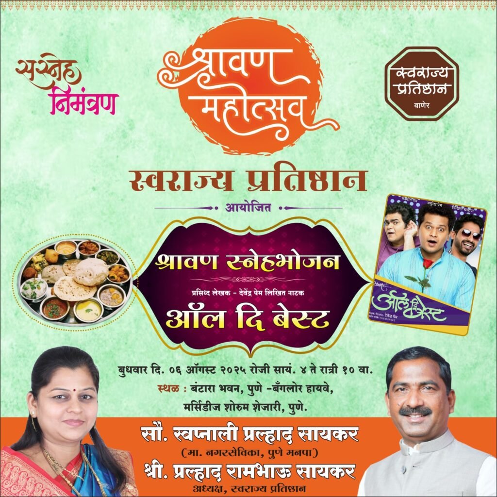 श्रावण महिन्याच्या निमित्ताने, ‘स्वराज्य प्रतिष्ठान’तर्फे बुधवार, ६ ऑगस्ट २०२५ रोजी माजी नगरसेविका सौ. स्वप्नाली प्रल्हाद सायकर आणि स्वराज्य प्रतिष्ठानचे अध्यक्ष श्री. प्रल्हाद रामभाऊ सायकर यांच्या वतीने ‘श्रावण महोत्सव’ आणि ‘श्रावण स्नेहभोजन’ कार्यक्रमाचे आयोजन करण्यात आले आहे. या कार्यक्रमाचे वैशिष्ट्य म्हणजे, या स्नेहभोजनाच्या निमित्ताने सुप्रसिद्ध लेखक देवेंद्र पेम लिखित गाजलेले ‘ऑल दि बेस्ट’ हे नाटक सादर केले जाणार आहे.