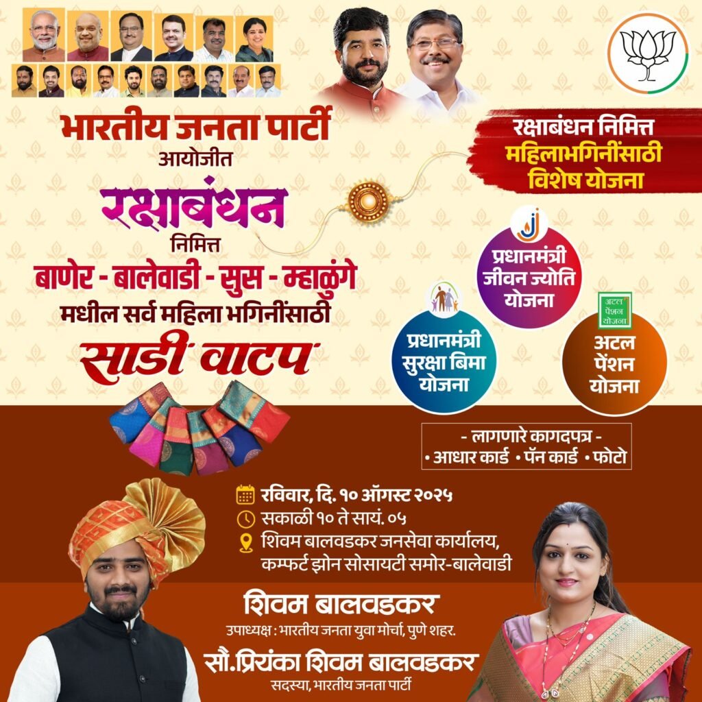 या कार्यक्रमाबद्दल बोलताना भारतीय जनता युवा मोर्चा, पुणे शहराचे उपाध्यक्ष शिवम बालवडकर म्हणाले की, “रक्षाबंधनाच्या या पवित्र सणाच्या निमित्ताने महिला भगिनींसाठी काहीतरी खास करावे, या उद्देशाने आम्ही या कार्यक्रमाचे आयोजन केले आहे. या कार्यक्रमात साडी वाटपाबरोबरच ‘पंतप्रधान जीवन ज्योती योजना’, ‘पंतप्रधान सुरक्षा विमा योजना’ आणि ‘अटल पेन्शन योजना’ यांसारख्या महत्त्वाच्या सरकारी योजनांची माहिती दिली जाईल, जेणेकरून महिलांना या योजनांचा लाभ घेता येईल.”