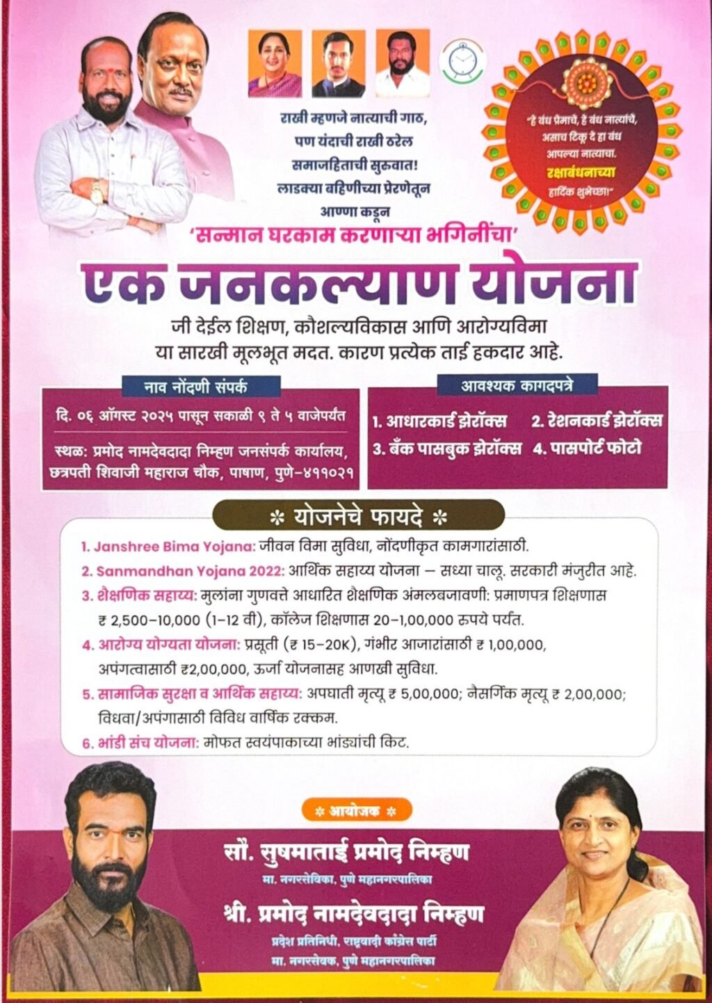 पाषाण येथे रक्षाबंधन निमित्त साधत मा. नगरसेवक श्री. प्रमोद नामदेव निम्हण आणि मा. नगरसेविका सौ. सुषमाताई निम्हण यांच्या वतीने घरकाम करणाऱ्या महिलांच्या सन्मानार्थ ‘एक जनकल्याण योजना’ शिक्षण कौशल्य विकास आणि आरोग्य विमा याचा लाभ मिळवून देण्यासाठी शिबिर आयोजित करण्यात आले आहे. या शिबिराला घरकाम काम करणाऱ्या महिला भगिनींचा उत्स्फूर्त प्रतिसाद मिळत आहे.